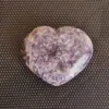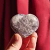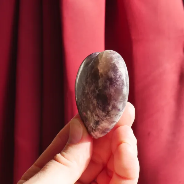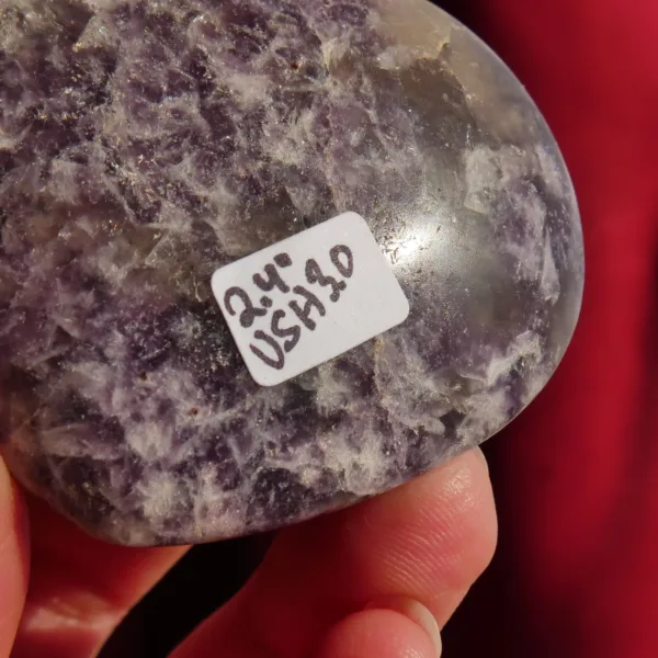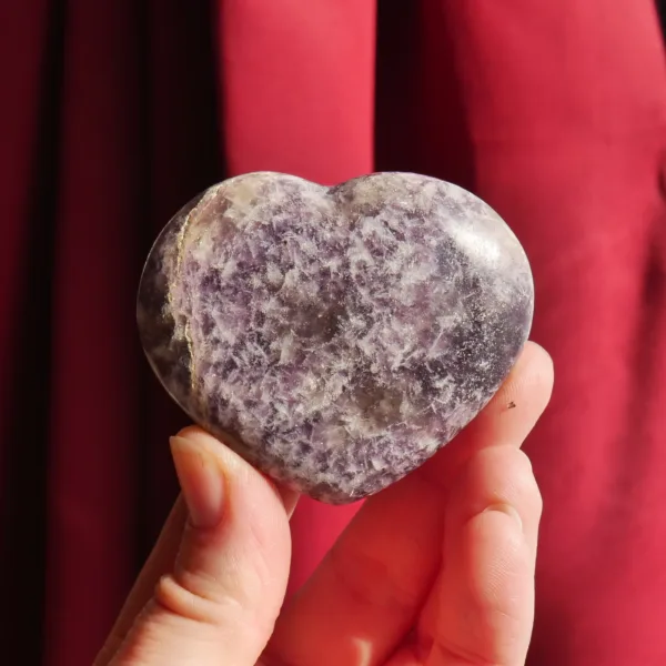 This beautiful glittery heart is carved from “Unicorn Stone” – a trade name for the naturally occurring mix of Lepidolite, Cleavelandite, Rubellite (aka Pink Tourmaline), and Smoky Quartz. This combination of minerals offers a truly unique experience to any collector – no two are ever alike, and the appearance can vary greatly. Due to the varying hardness of the minerals within these pieces, this material can be quite difficult to polish. This heart is perfect for use as a carry stone or in various forms of energy work. For best description, please see photos – you will receive the exact piece shown here.